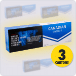 This bundle ships as a single compact parcel with 3 individually wrapped cartons of Canadian Lights. Each pack is foil-sealed to preserve the smooth flavor and easy draw.